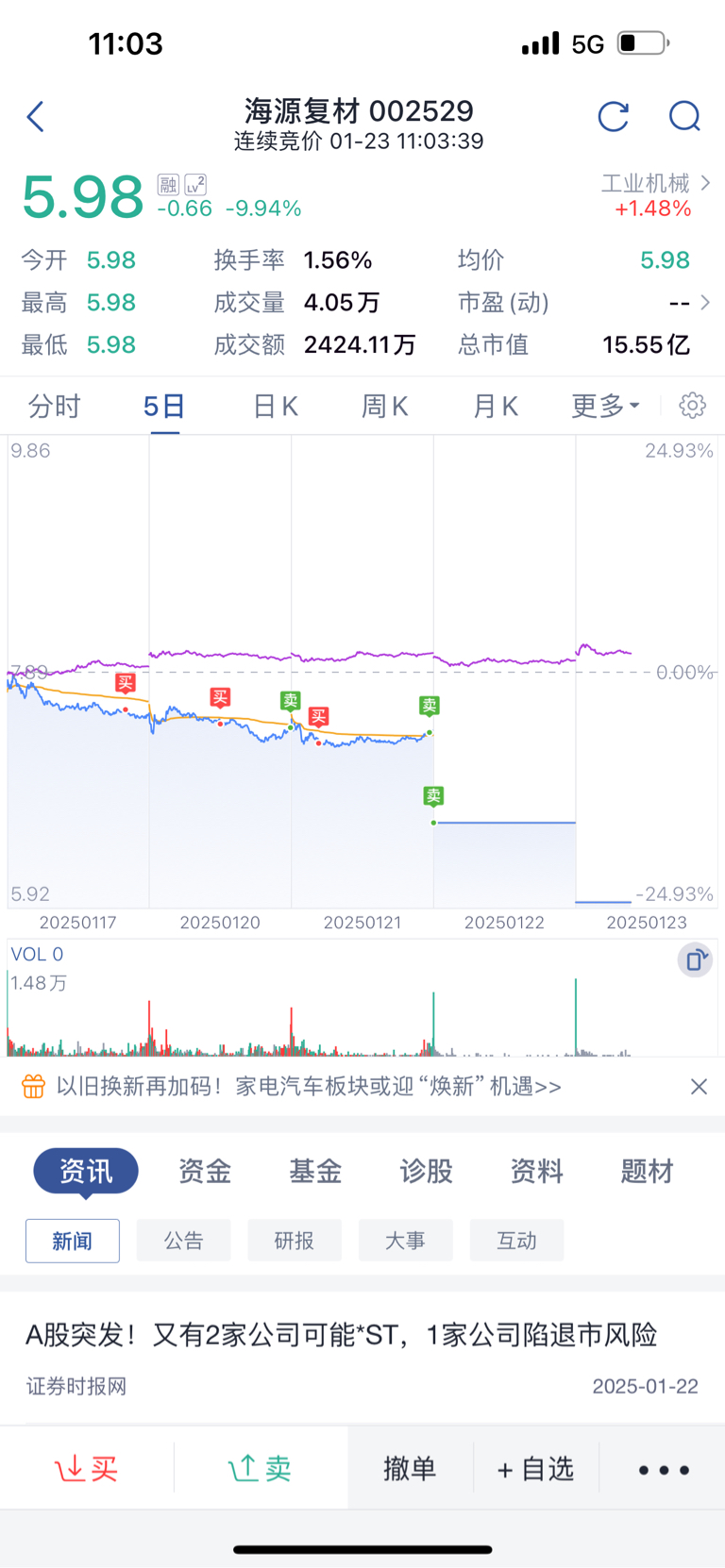 隔夜单了,抱有侥幸心理就会跟海源一样2个跌停出不来,所以不想多说,今天买入的环球