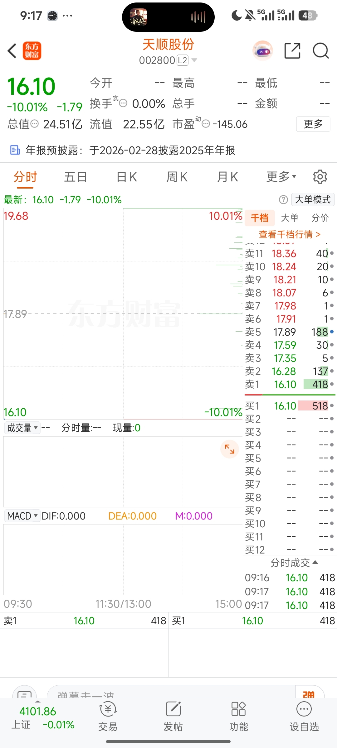 $天顺股份(SZ002800)$ 这估计基本上已经完全控盘了 ,抛压很小,300手竞价就能压到接近跌停。