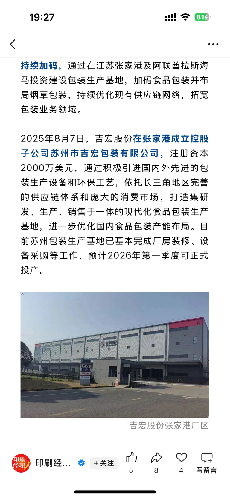 $吉宏股份(SZ002803)$ 张家港包装基地一季度投产!这个项目悄咪咪的,之前没听说。