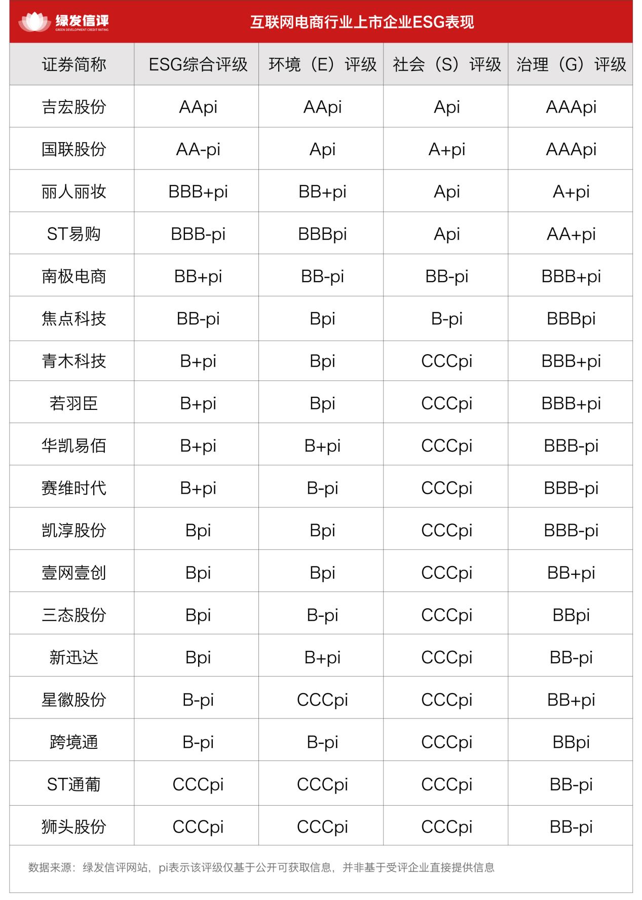 绿发信评ESG主动评级结果显示,吉宏股份以AApi评级位列行业第一,国联股份获得AA-pi评级紧随其后,两家企业在治理维度均表现优秀,均获得AAApi评级。此外,丽人丽妆获BBB+pi评级,ST易购获BBB-pi评级。