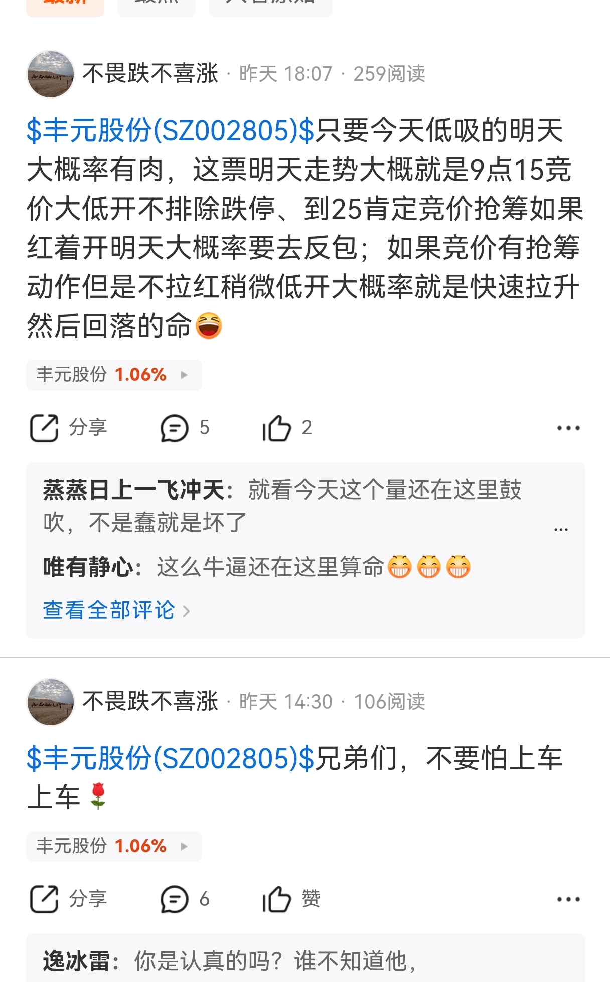 $丰元股份(SZ002805)$ 这种走势的票要是怕就可以退出市场了;股吧里大部分都是毛都不懂的韭菜就喜欢背口诀,背口诀能挣钱那就都能挣钱;我其实不咱喜欢发动态评论涨跌、对了说你猜错了一堆骂人的;但想着都是散户在这个市场不容易都是从亏损一步一步走过来的、能帮一个是一个