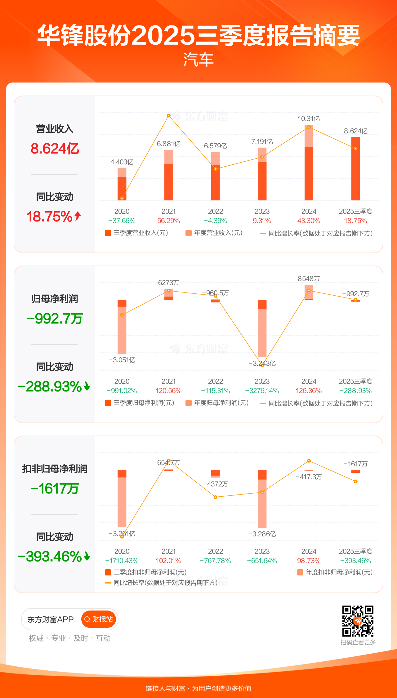华锋股份10月29日发布2025年三季报显示,公司前三季实现营业收入8.62亿元,同比增长18.75%;归母净利润-992.68万元;扣非归母净利润-1616.83万元。