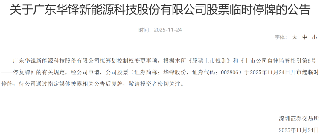 11月24日早间,深交所公告,广东华锋新能源科技股份有限公司拟筹划控制权变更事项,根据本所《股票上市规则》和《上市公司自律监管指引第6号——停复牌》的有关规定,经公司申请,公司股票(证券简称:华锋股份,证券代码:002806)于2025年11月24日开市起临时停牌。