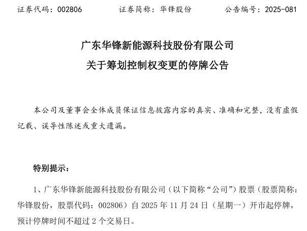 华锋股份(002806)11月24日午间公告,公司控股股东、实际控制人及董事长谭帼英(简称“乙方”)于11月22日与陈运(简称“甲方”)签署了《股权转让意向协议》。甲方或甲方控制的第三方拟一次性或者分期收购乙方持有的上市公司股权,并结合表决权委托方式,以取得上市公司控制权。若本次交易最终实施完成,公司控股股东及实际控制人将发生变更。