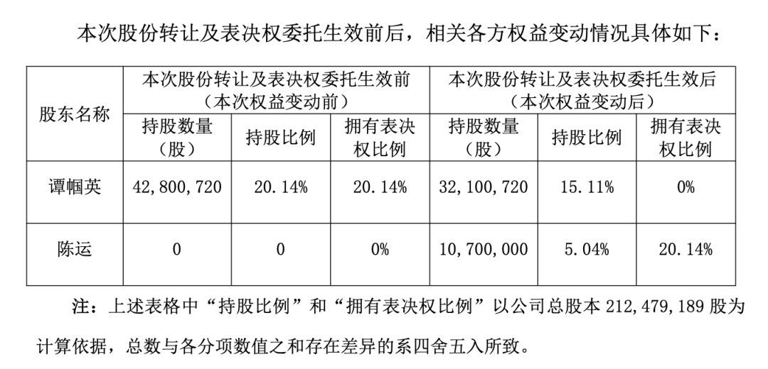 本次转让标的股份为1070万股,占总股本5.04%,转让价格为15元/股(停牌前收盘价为13.22元/股),股份转让价款合计为1.61亿元。同时,谭帼英将其剩余3210.07万股股份的表决权委托给陈运行使。