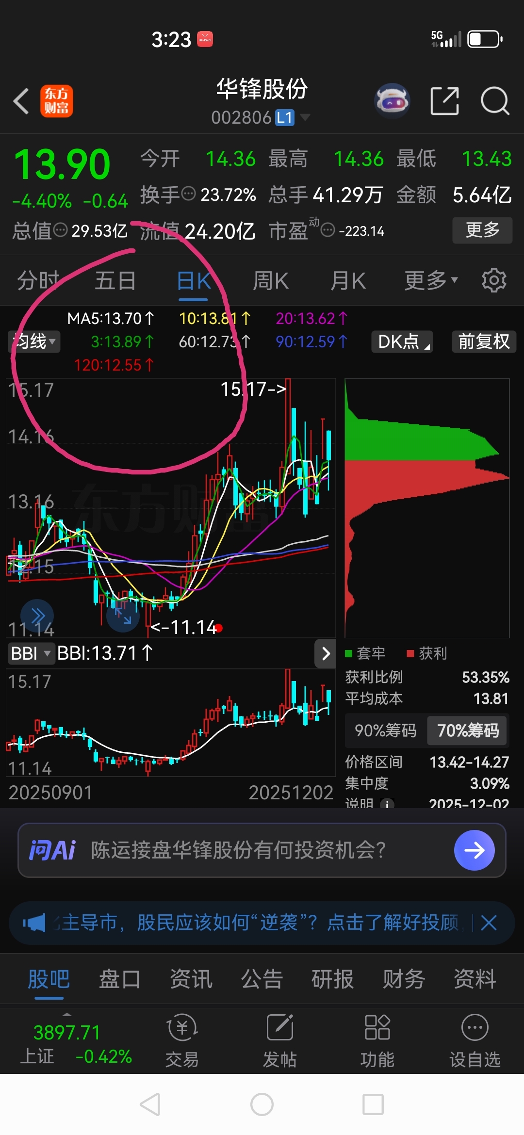 你们不知道T为什么会收在13.90,我告诉你们,因为有个3日线13.89看圈中绿色,周K一直在拿货,昨天涨停是主力行为,筹码集中度为5,收盘收在3日线之上,仍然保持攻击力不变,比浪潮安全多了