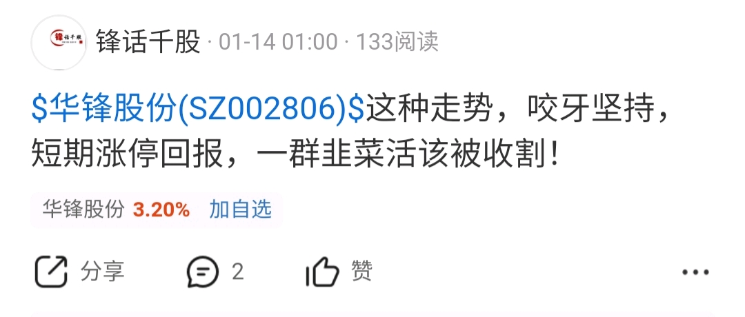 $华锋股份(SZ002806)$ 一月14号开始没有涨停,原来涨不停,也是一个缓冲垫