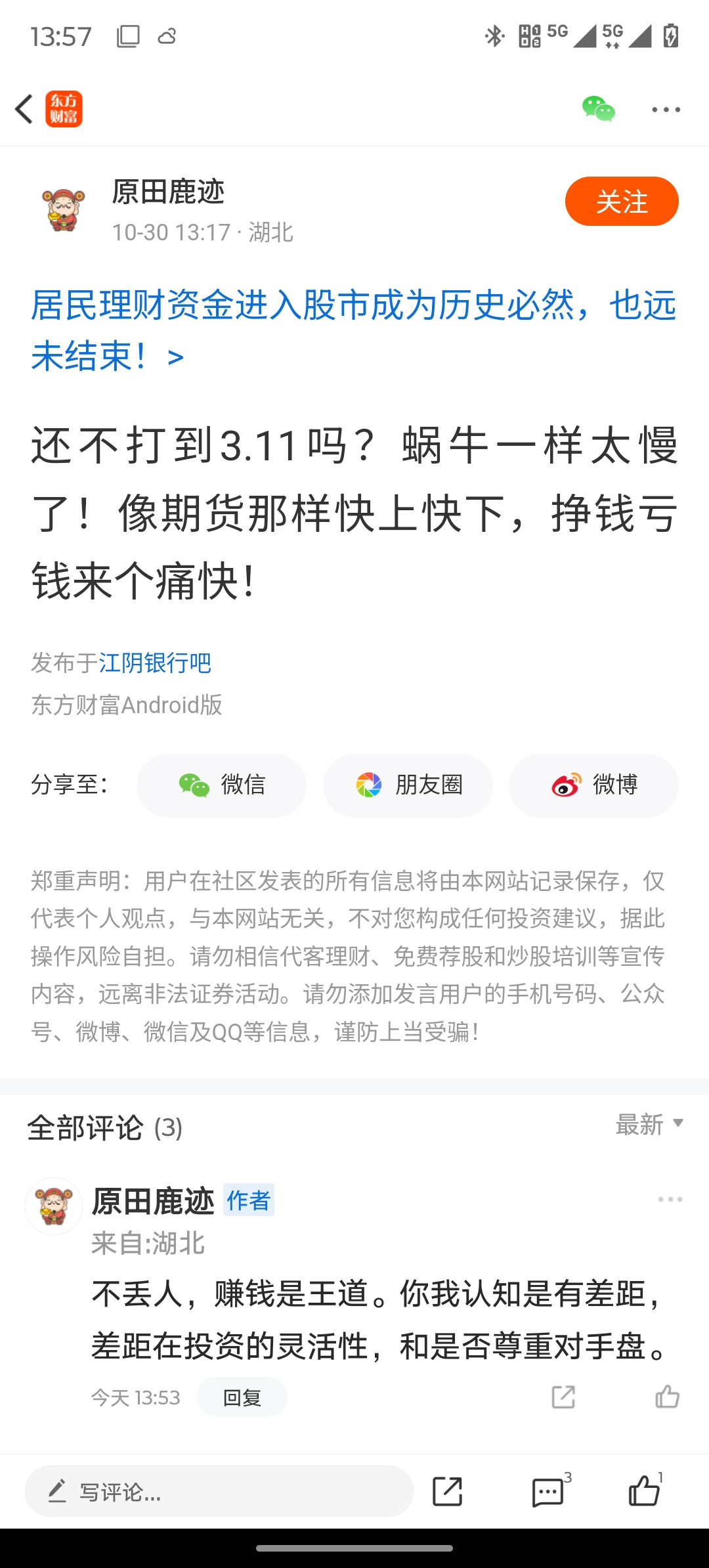 温馨提示: 1.根据《证券法》规定,禁止编造、传播虚假信息或者误导性信息,扰乱证券市场;2.用户在本社区发表的所有资料、言论等仅代表个人观点,与本网站立场无关,不对您构成任何投资建议。用户应基于自己的独立判断,自行决定证券投资并承担相应风险。《东方财富社区管理规定》