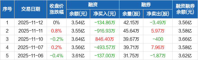 江阴银行:融资净偿还134.86万元,融资余额3.54亿元(11-12)