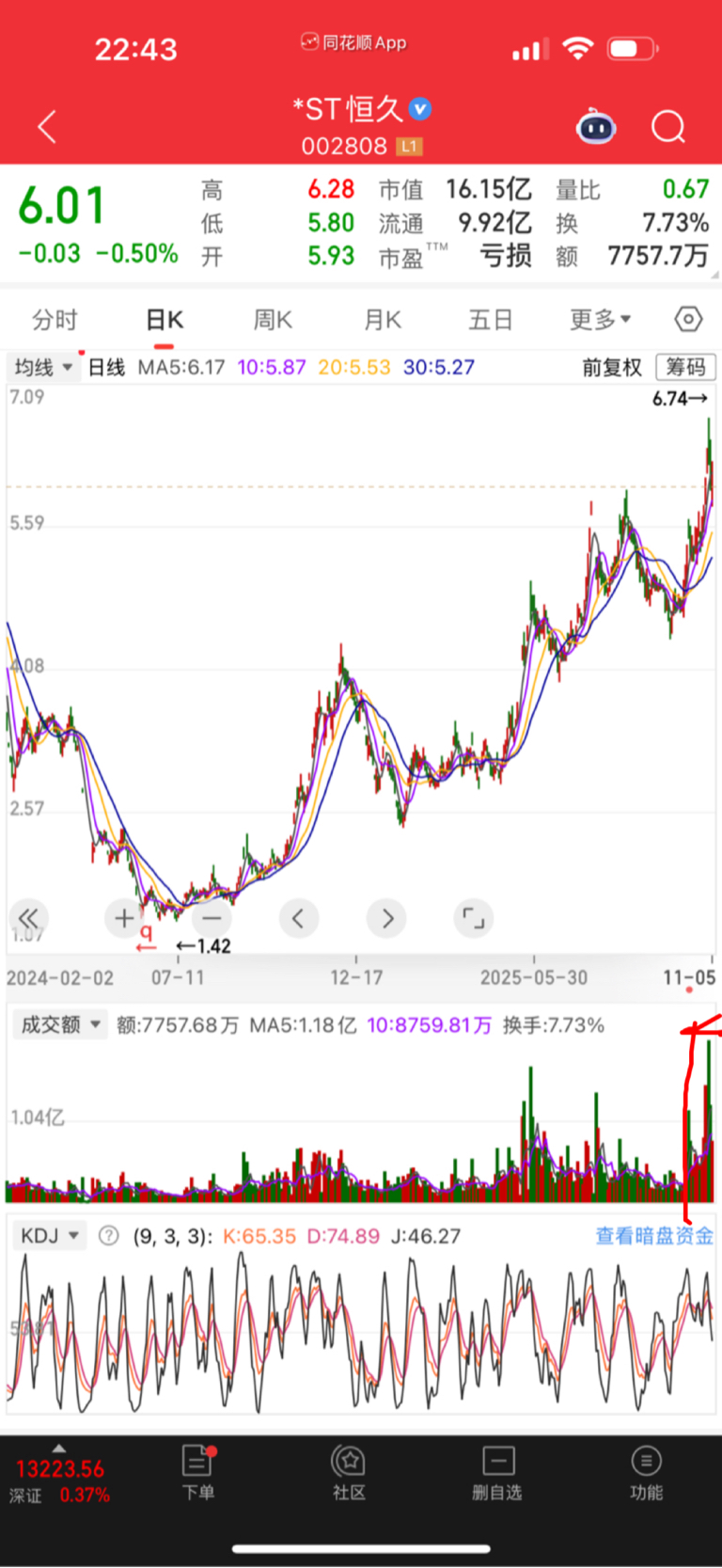 $*ST恒久(SZ002808)$ 这明明是见顶了,1元多涨到6元多放量。不信找100只股,98只从低位涨到高位放量,即出货完了。但不会马上a杀,长期以后会很惨。我也不知道为什么,在高位接了盘