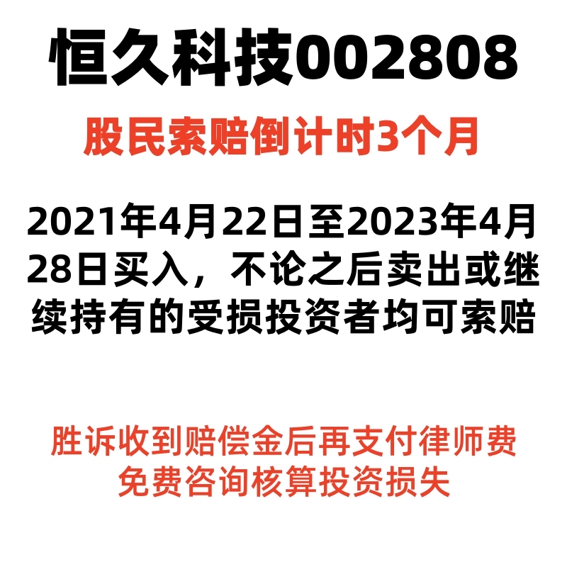 $*ST恒久(SZ002808)$ 2021年04月22日至2023年04月28日(含)期间有买入且在2023年04月28日后卖出或继续持有的受损投资者可索赔
