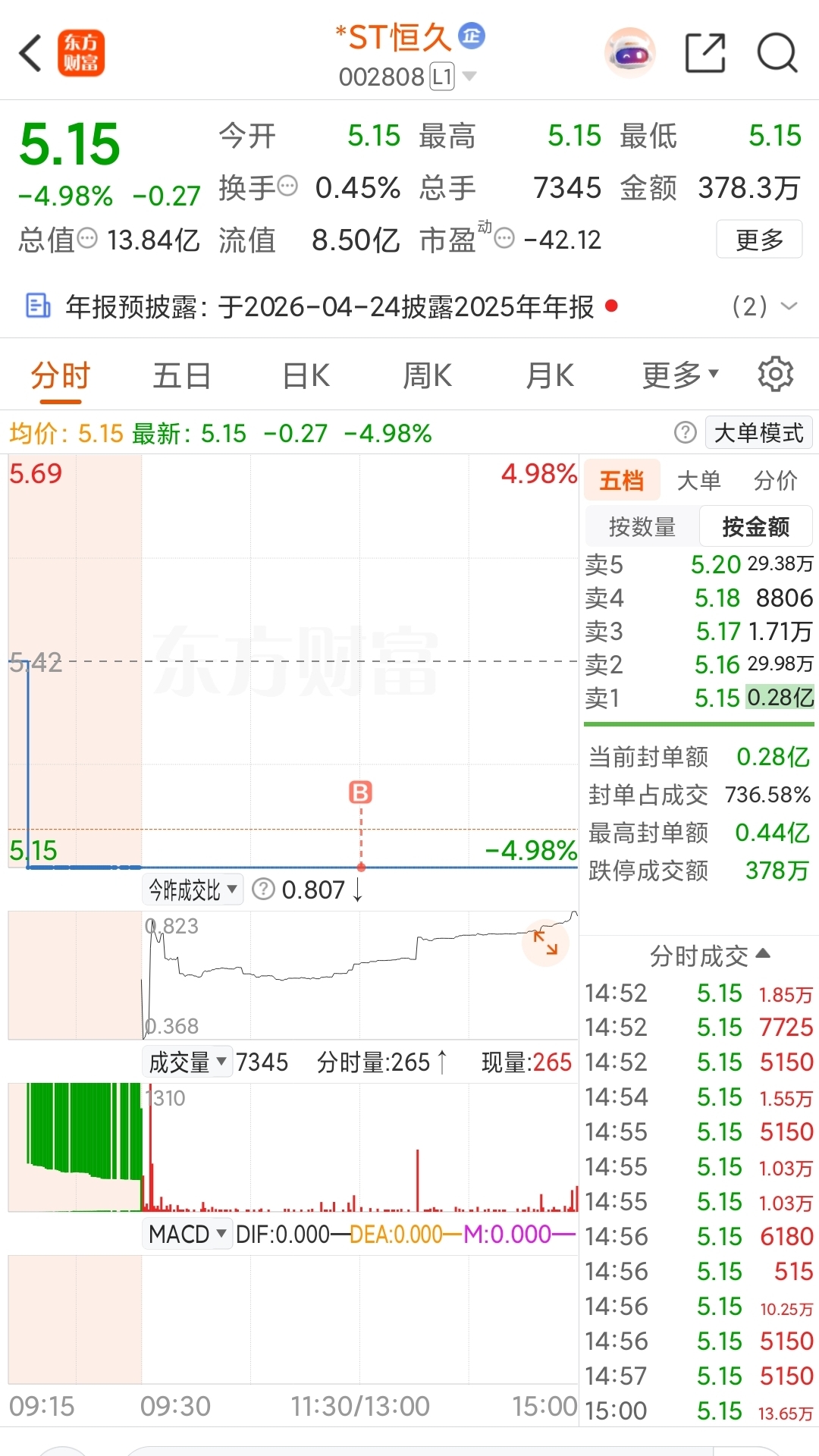 $*ST恒久(SZ002808)$ 完了,这股什么情况呢,今天进来的,想到明天要吃跌停心里好慌.这不得亏25块阿?