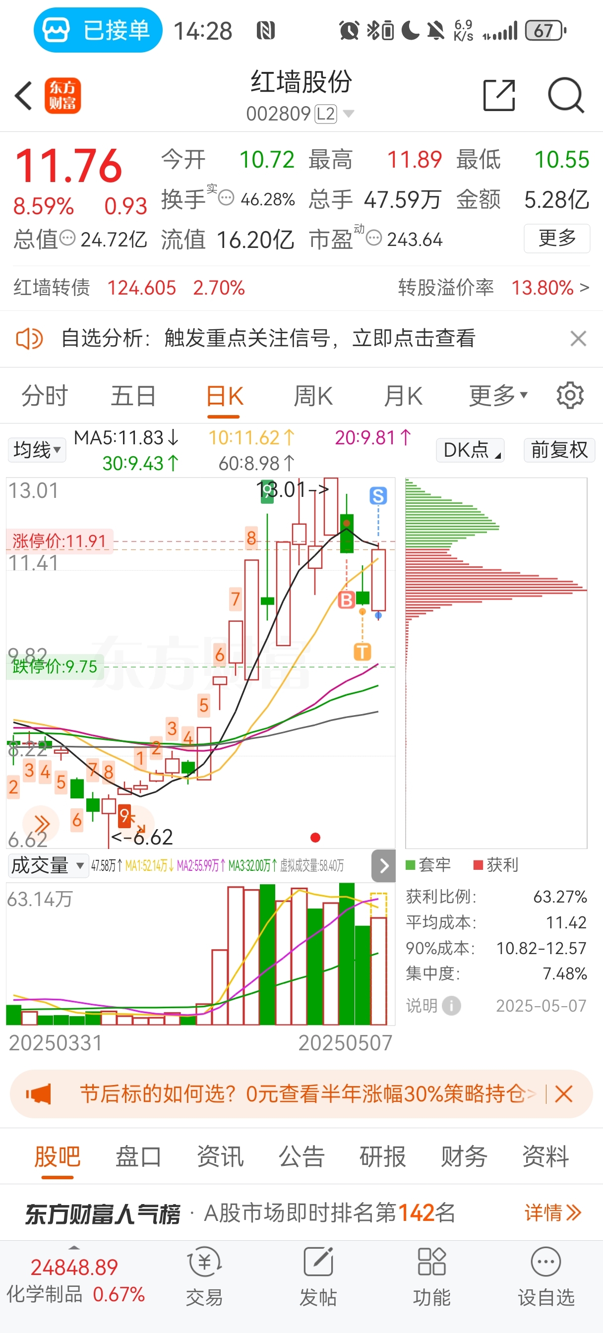$红墙股份(SZ002809)$ 他m的又是一卖就起飞 老子销户得了