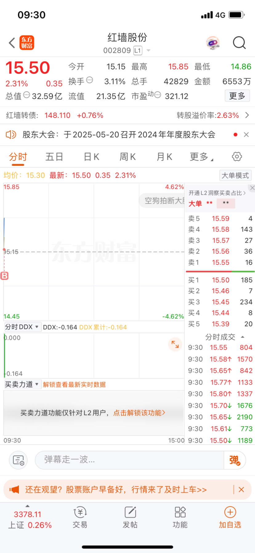 开盘选择介入个股$红墙股份(SZ002809)$ 值得期待#强势机会# #实盘记录# #投资干货#