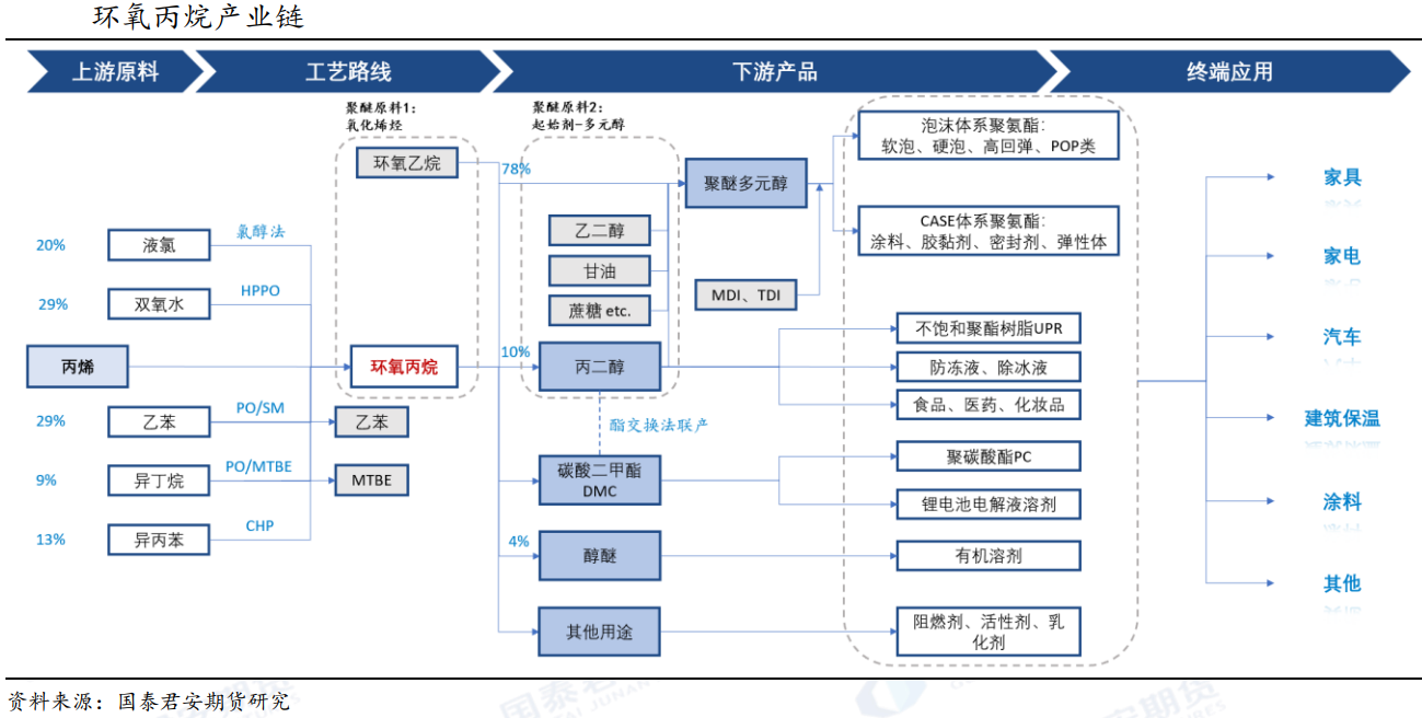 据国泰君安期货研报,目前我国环氧丙烷的生产工艺主要包括氯醇法、共氧化法、CHP法和HPPO法,其中氯醇法占比约20%,共氧化法(PO/SM与PO/MTBE)合计约38%,CHP法约13%,而HPPO法约29%。中游环节以环氧丙烷为核心产品,行业总产能已超过800万吨/年,主要集中在山东和华东地区。