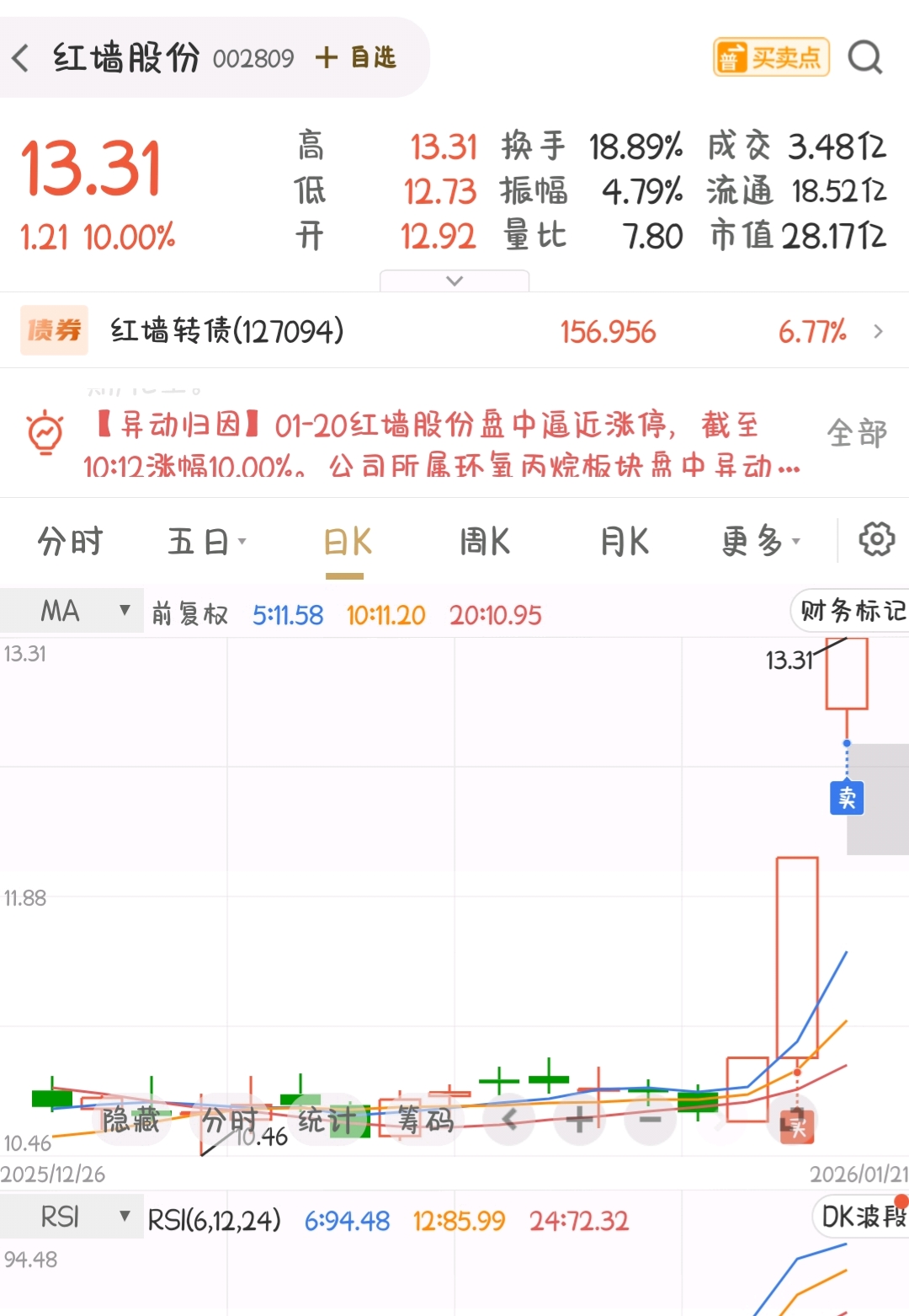 $红墙股份(SZ002809)$ 昨天红宝丽板了马上进来了,跟风股,市值小比较好控盘,今天红宝丽炸了就走了,留下的发财吧。