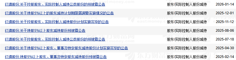自去年以来,红墙股份曾多次披露减持公告。1月13日,红墙股份公告,公司控股股东、实控人刘连军计划15个交易日后的3个月内,以集中竞价交易的方式减持公司股份不超过211.61万股,减持比例不超过公司总股本的1%。