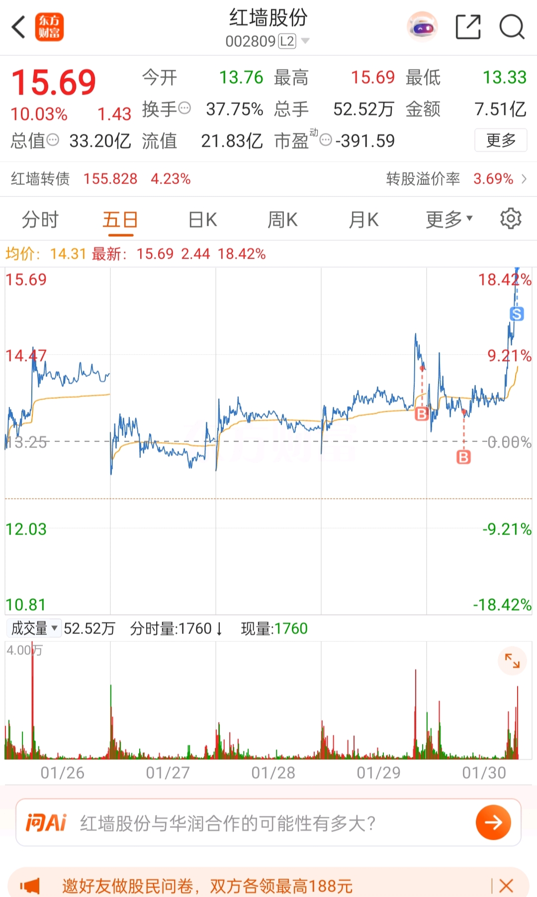 $红墙股份(SZ002809)$ MD可算是吃个涨停了
