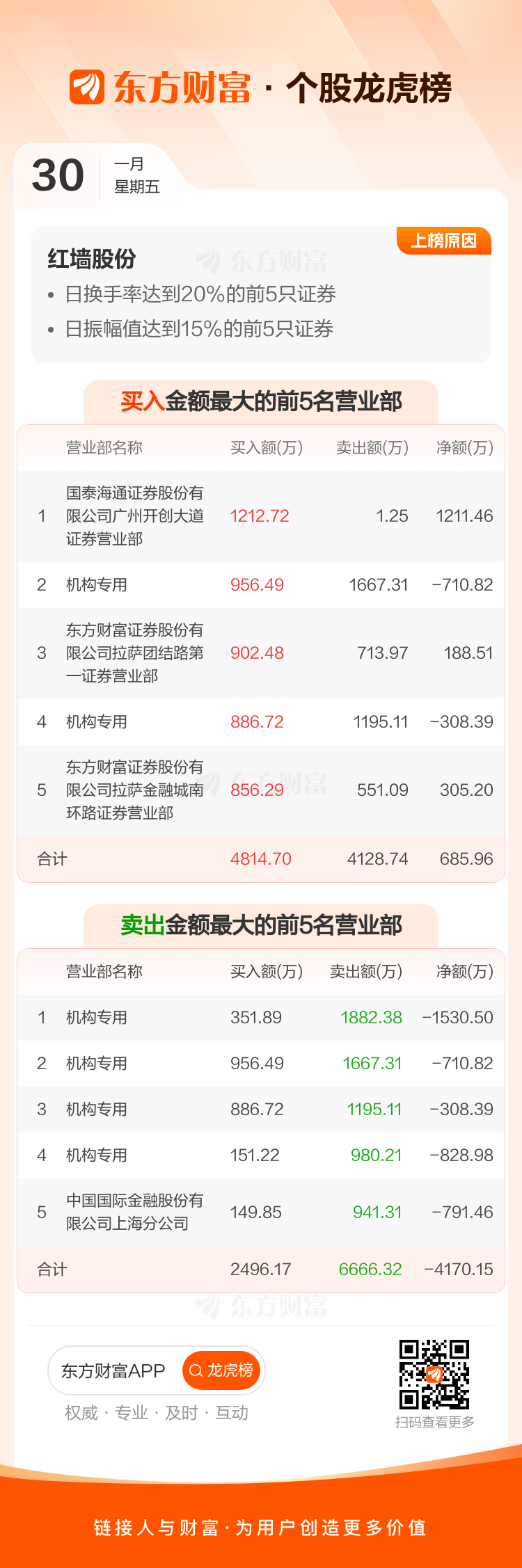 交易所2026年1月30日公布的交易公开信息显示,红墙股份因成为日换手率达到20%的前5只证券、日振幅值达到15%的前5只证券上榜。红墙股份当日收报15.33元,涨跌幅7.50%,偏离值42.07%,换手率42.75%,成交额8.59亿。