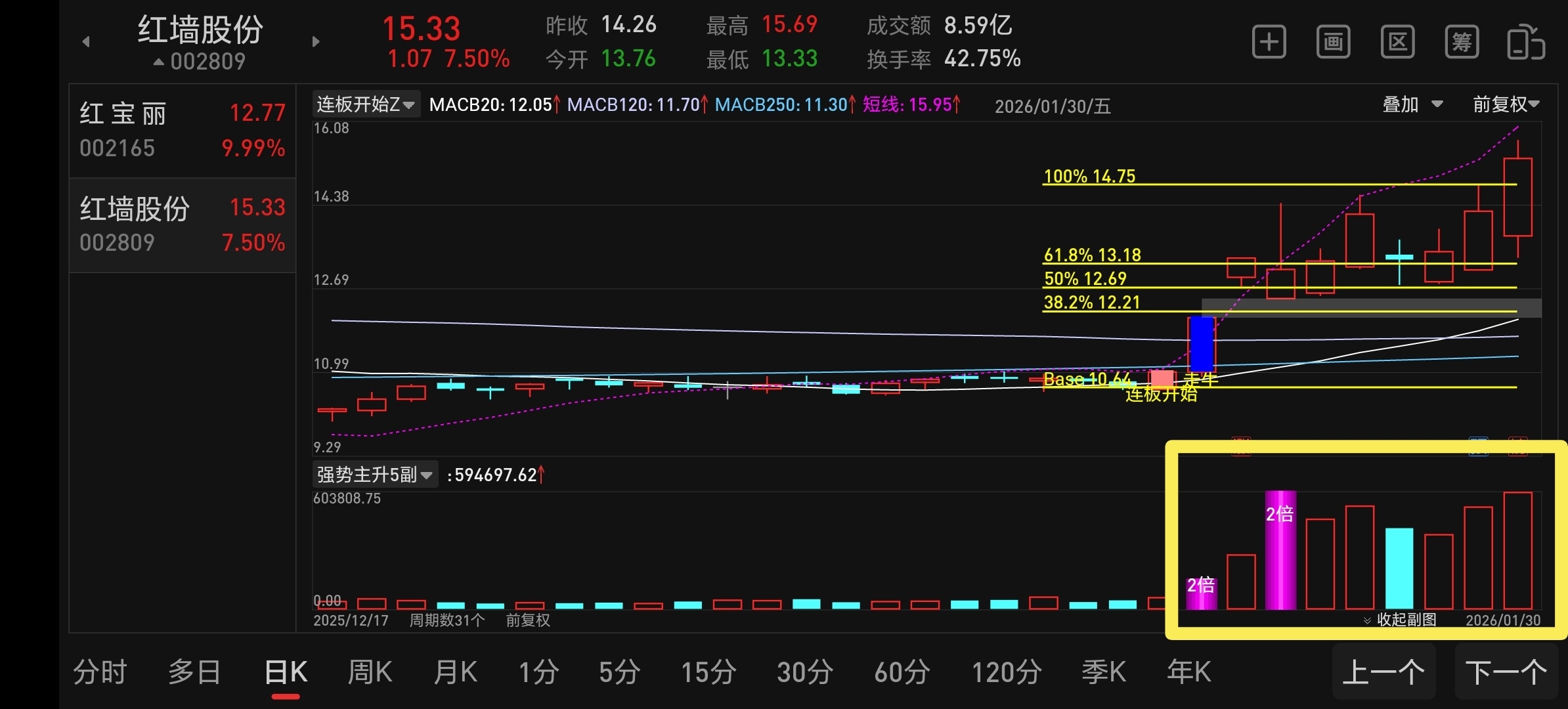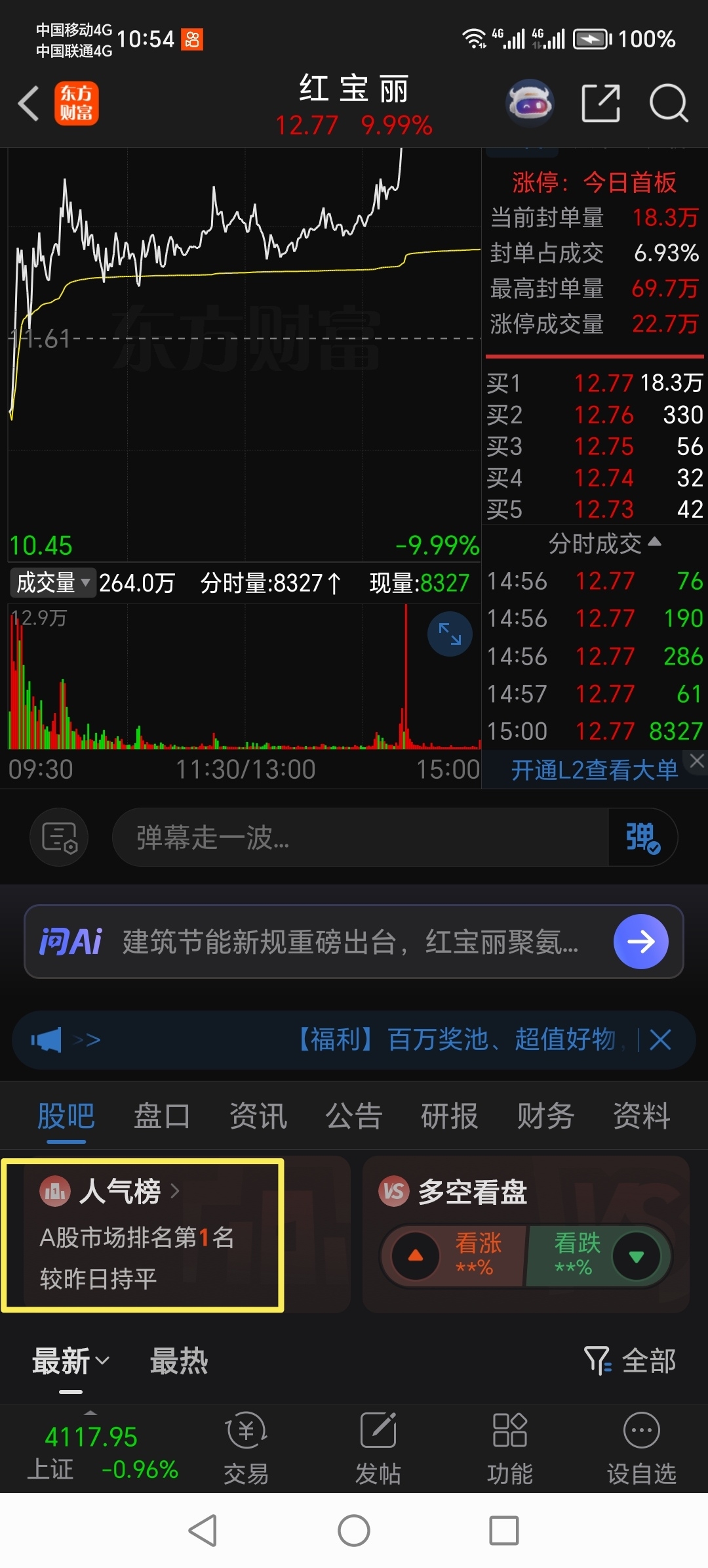 $红墙股份(SZ002809)$ 红宝子已经排上人气榜第一了,还有啥好说的,下周化工板块起飞,量能来看,红墙的量能可以与红宝子的量能并驾齐驱,估计红宝要走一字板了,红墙会弱吗,大口喝酒大块吃肉走起!车上的拿好了,坐稳了,只做预判不做马后炮,记录个人投资历程,观点不构成操作建议!