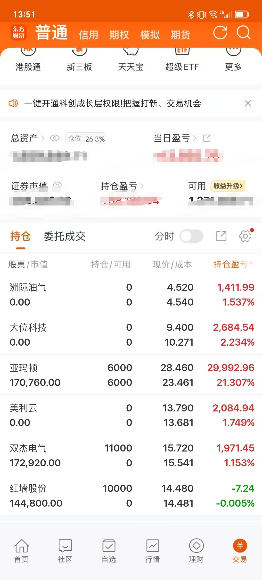 介入:、成本价14.81元。成本价15.54元。卖出:洲际油气、大位科技、美利云
