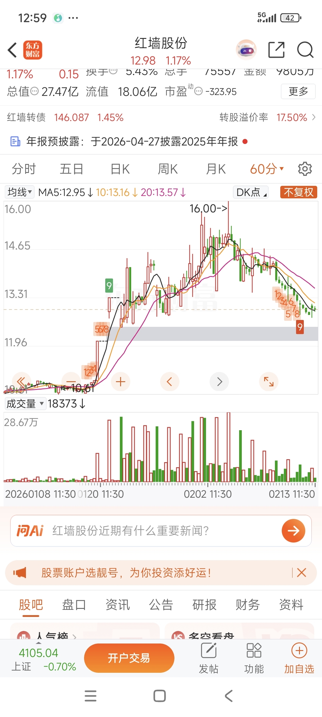 $红墙股份(SZ002809)$ 已经14根60分钟阴K线了,下午再来二根,年后再来二根,18根阴K线!