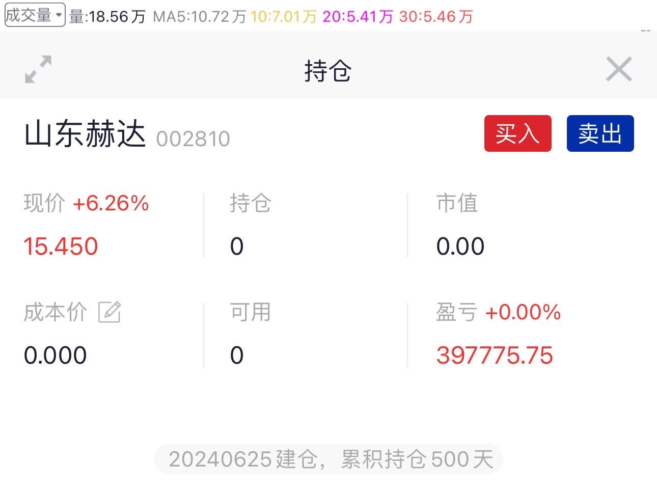 $山东赫达(SZ002810)$ 和老毕酣战的第500天,15.55清仓,期待下一个周期,暂时休战