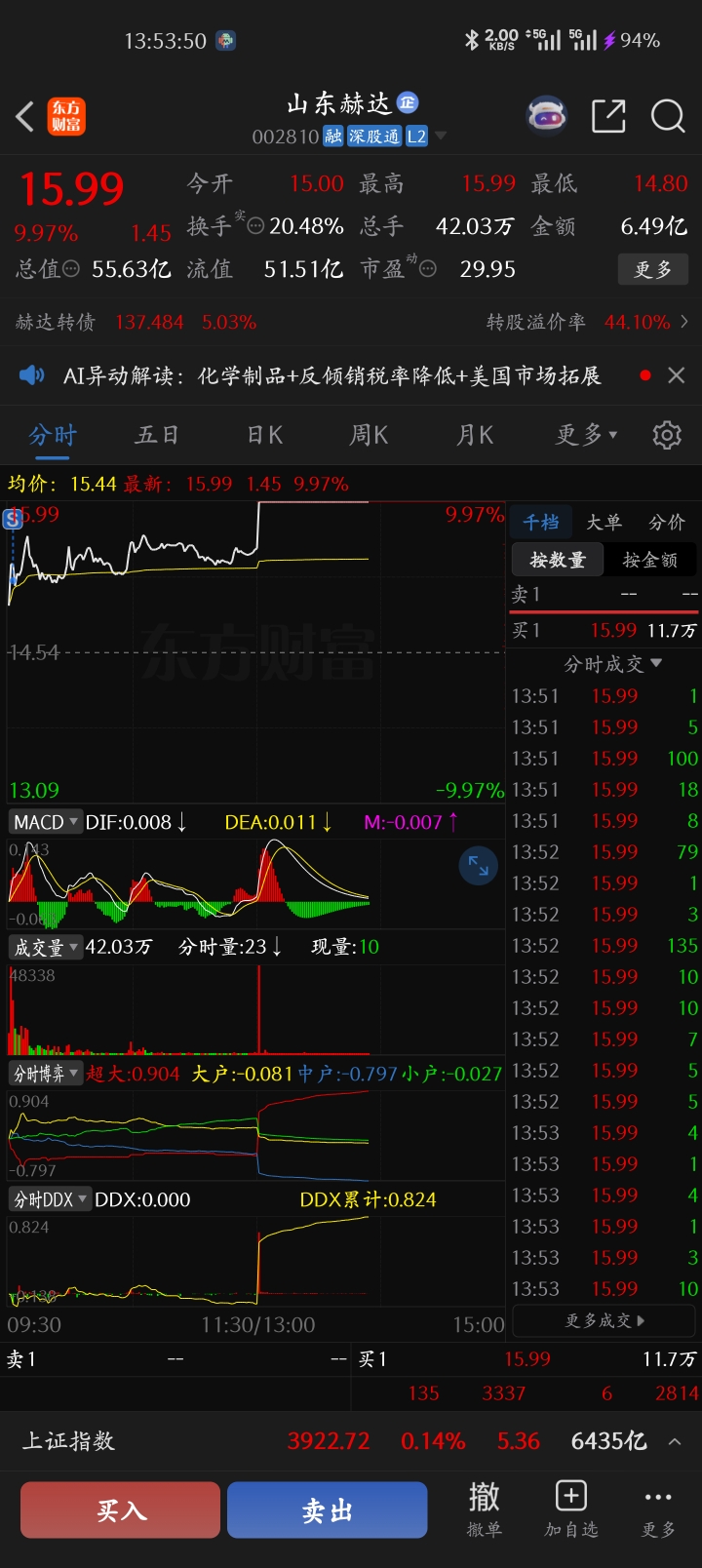 $山东赫达(SZ002810)$ 恭喜大家,希望你们一直连板,我喝汤就很满意了