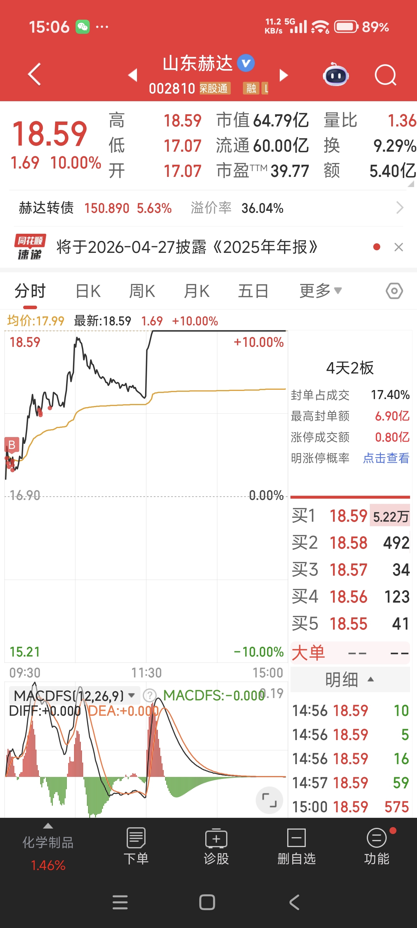$山东赫达(SZ002810)$ 本来预计16.5慢慢接回,早盘竞价抢单很凶,高开后没啥卖单,只能强行追高,熬过了上午的震荡,打算下午1.30不封板就走,结果下午开盘封板,谢谢主力打赏,下周开板留个底仓拧起裤子就跑