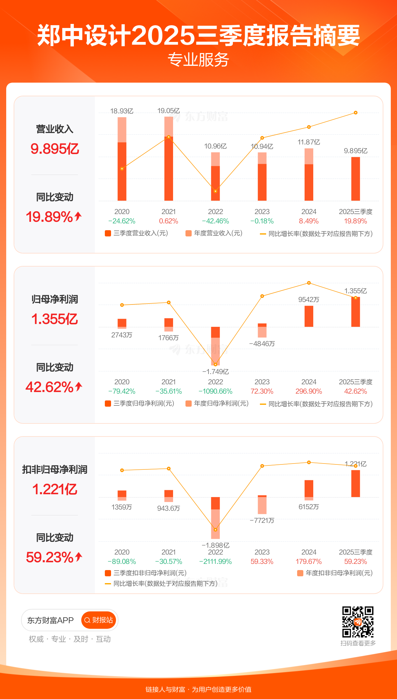 郑中设计10月31日发布2025年三季报显示,公司前三季实现营业收入9.89亿元,同比增长19.89%;归母净利润1.35亿元,同比增长42.62%;扣非归母净利润1.22亿元,同比增长59.23%。