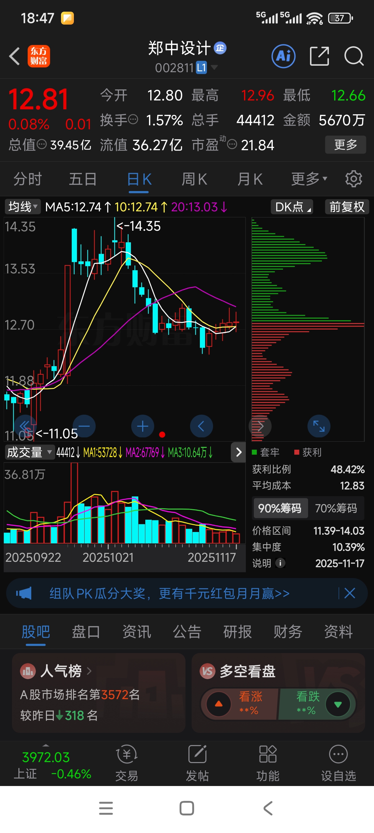 $郑中设计(SZ002811)$ 反弹行情明显没有走完啊,这两天暂时受制于20天线的压制,震荡两天一个措手不及就上去了。13.7下边的套牢筹码并不多,也是前期主力拉涨停的区间,没必要在这个地方卖掉,不追高就没什么风险 。这个股是个冷门股,市场关注度不高,人声鼎沸时,记得离开就行