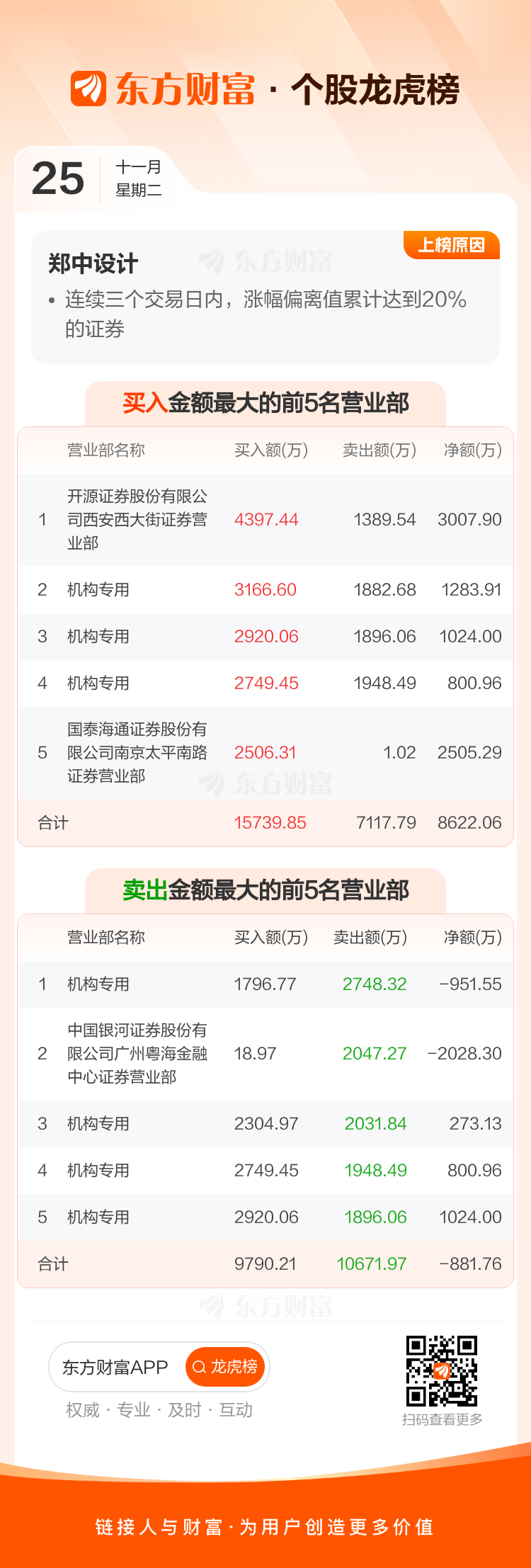 交易所2025年11月25日公布的交易公开信息显示,郑中设计因成为连续三个交易日内,涨幅偏离值累计达到20%的证券上榜。郑中设计当日收报16.01元,涨跌幅7.31%,换手率20.92%,成交额9.19亿。异常期间11月21日至11月25日,期间涨幅20.56%,累计偏离值21.76%,区间成交额19.72亿。