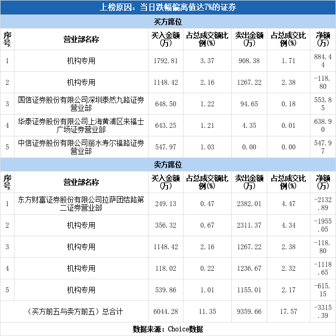 龙虎榜数据显示,今日共6个机构席位出现在龙虎榜单上,分别位列买一、买二、卖二、卖三、卖四、卖五,合计净卖出2923.22万元,占龙虎榜净卖额的88.17%。除此之外还有北京君正、光启技术、海科新源等33只个股榜单上出现了机构的身影,其中16家呈现机构净买入,获净买入最多的是北京君正,净买额为2.51亿元;17家呈现机构净卖出,其中遭净卖出最高的为海科新源,净卖额为1.42亿元。