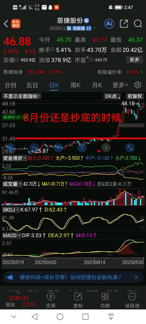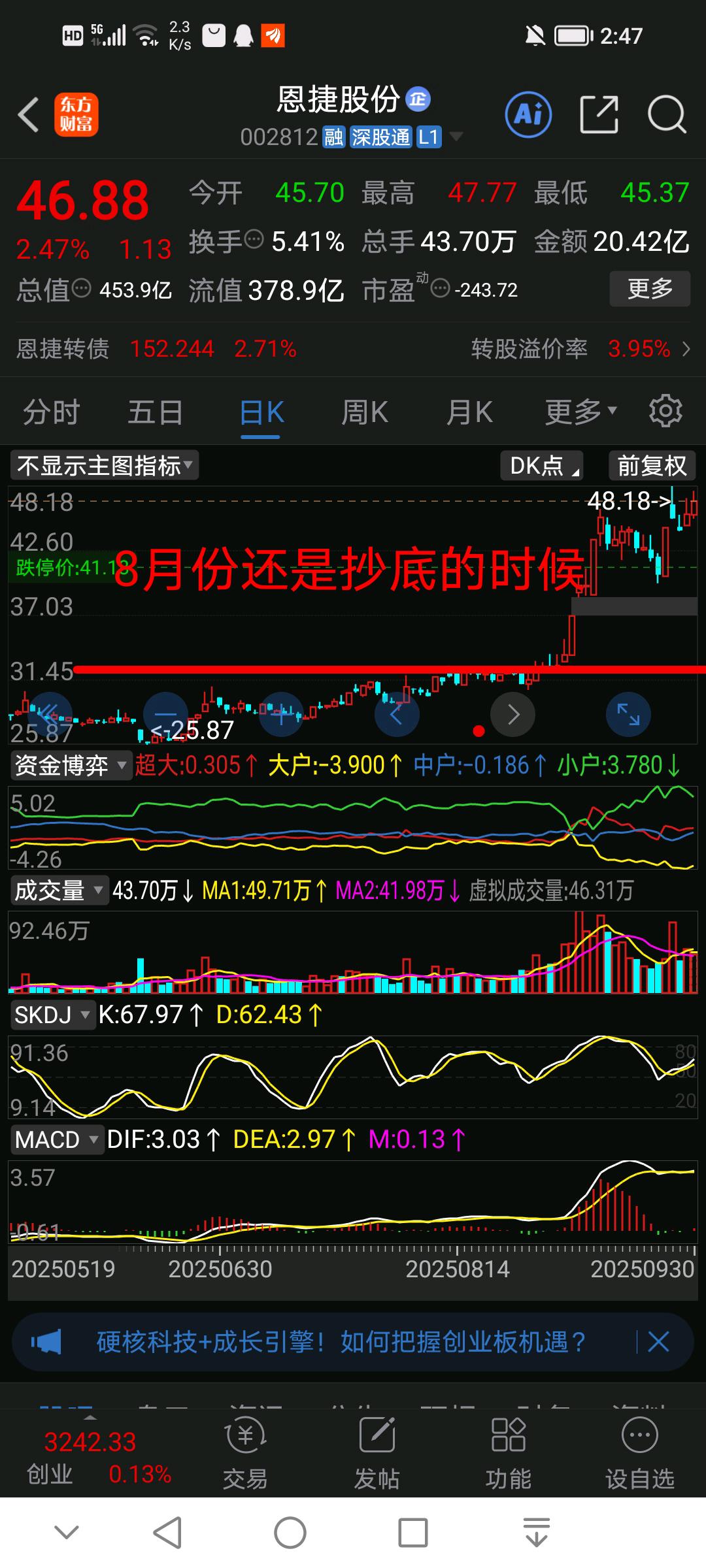 恩捷股份技术面是抄底时候,前提是不st,退市,财务造假,和隔膜不用了,靠包装撑不起这么大市值,只是技术面她确实是长线抄底