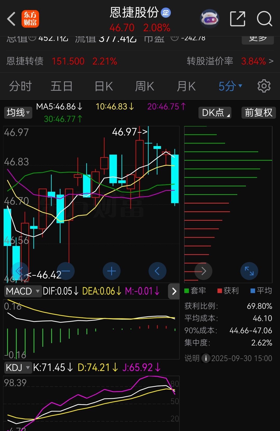 $恩捷股份(SZ002812)$ 五分钟级别 十五分钟级别最后半小时放量了MACD绿柱放大 国庆开拍先看下跌个人浅见,不喜勿喷。我自己也持有,但是大周期向上不变,可能五月均线要震荡一下