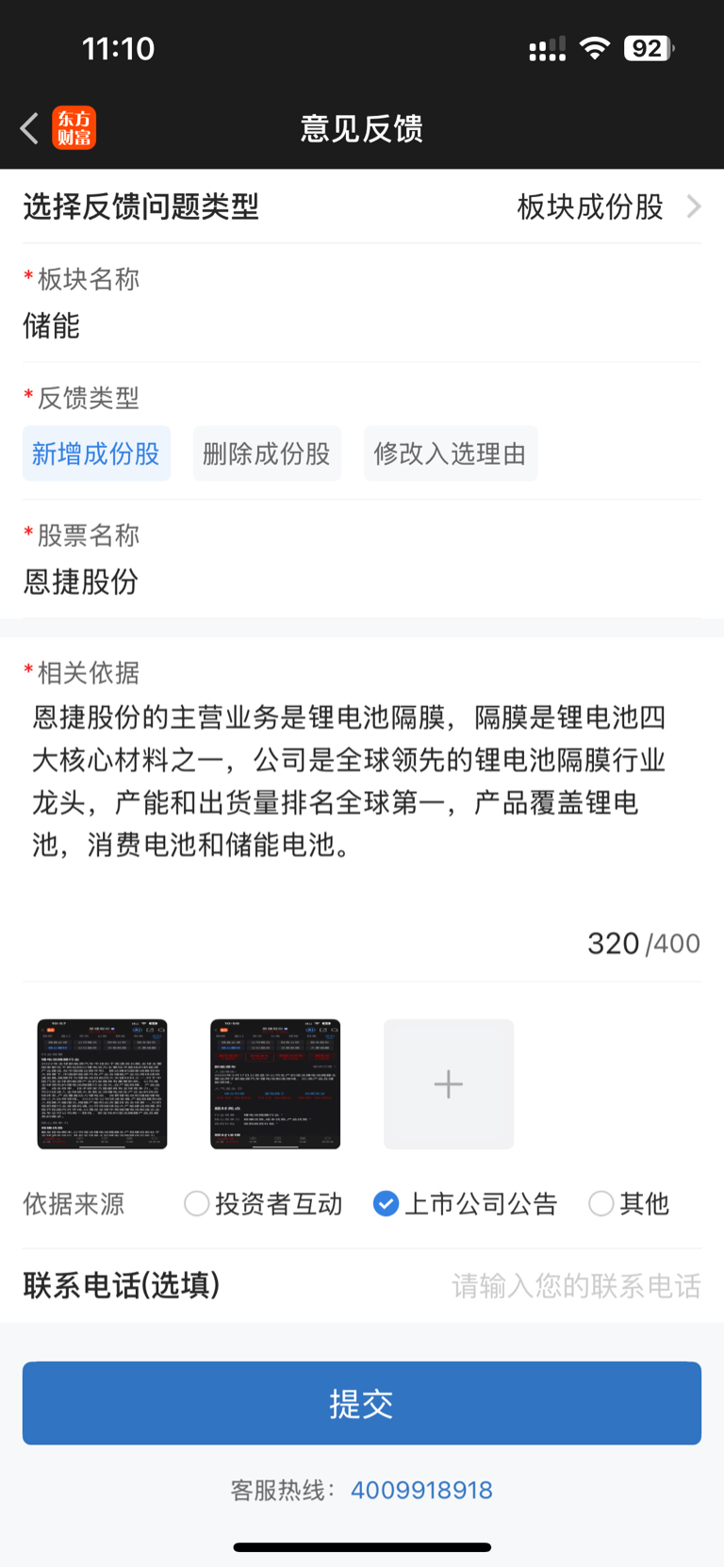 买恩捷的股友们,大家有空去储能板块里反馈问题,把恩捷股份增加进去,反馈的人越多,