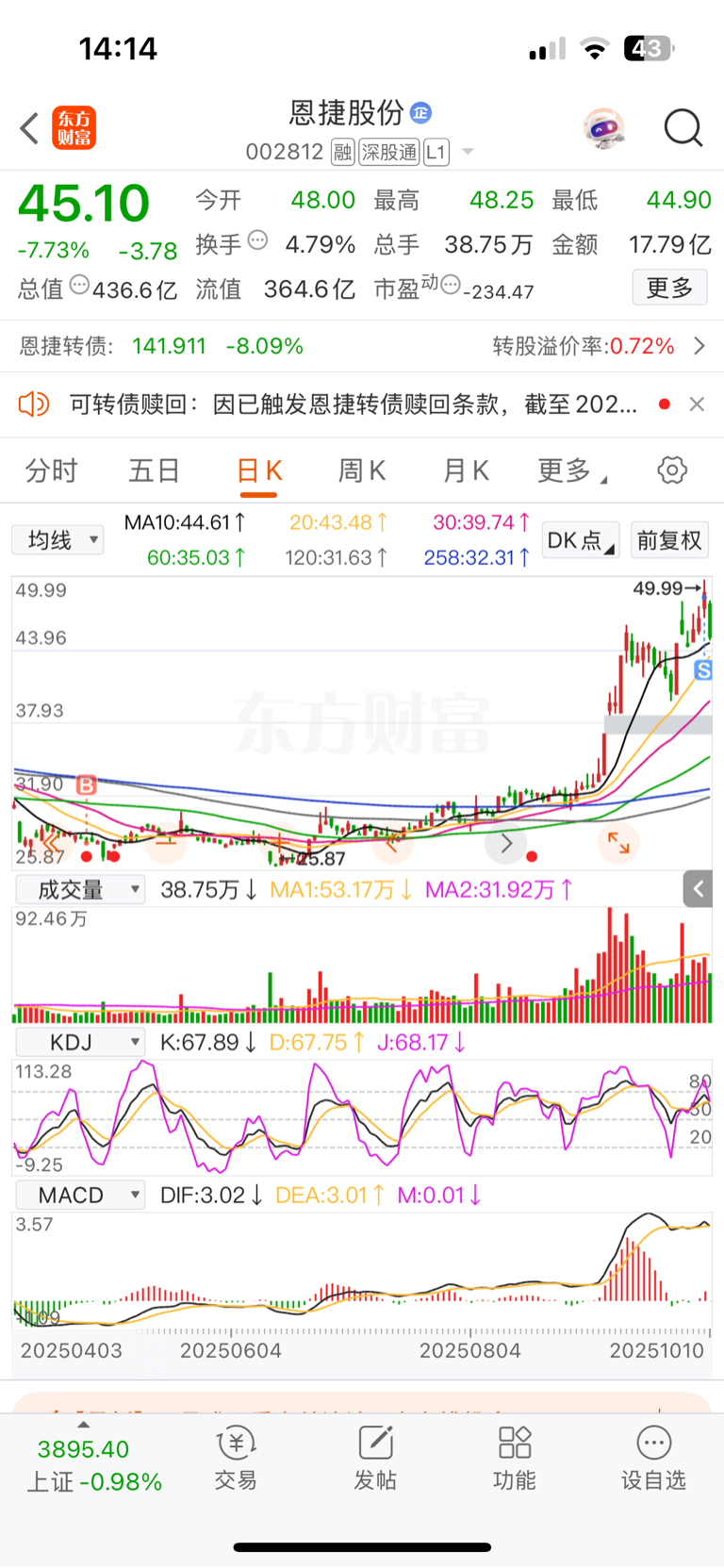 $恩捷股份(SZ002812)$ 得亏昨天卖了,电池涨的多了,风险有点大了