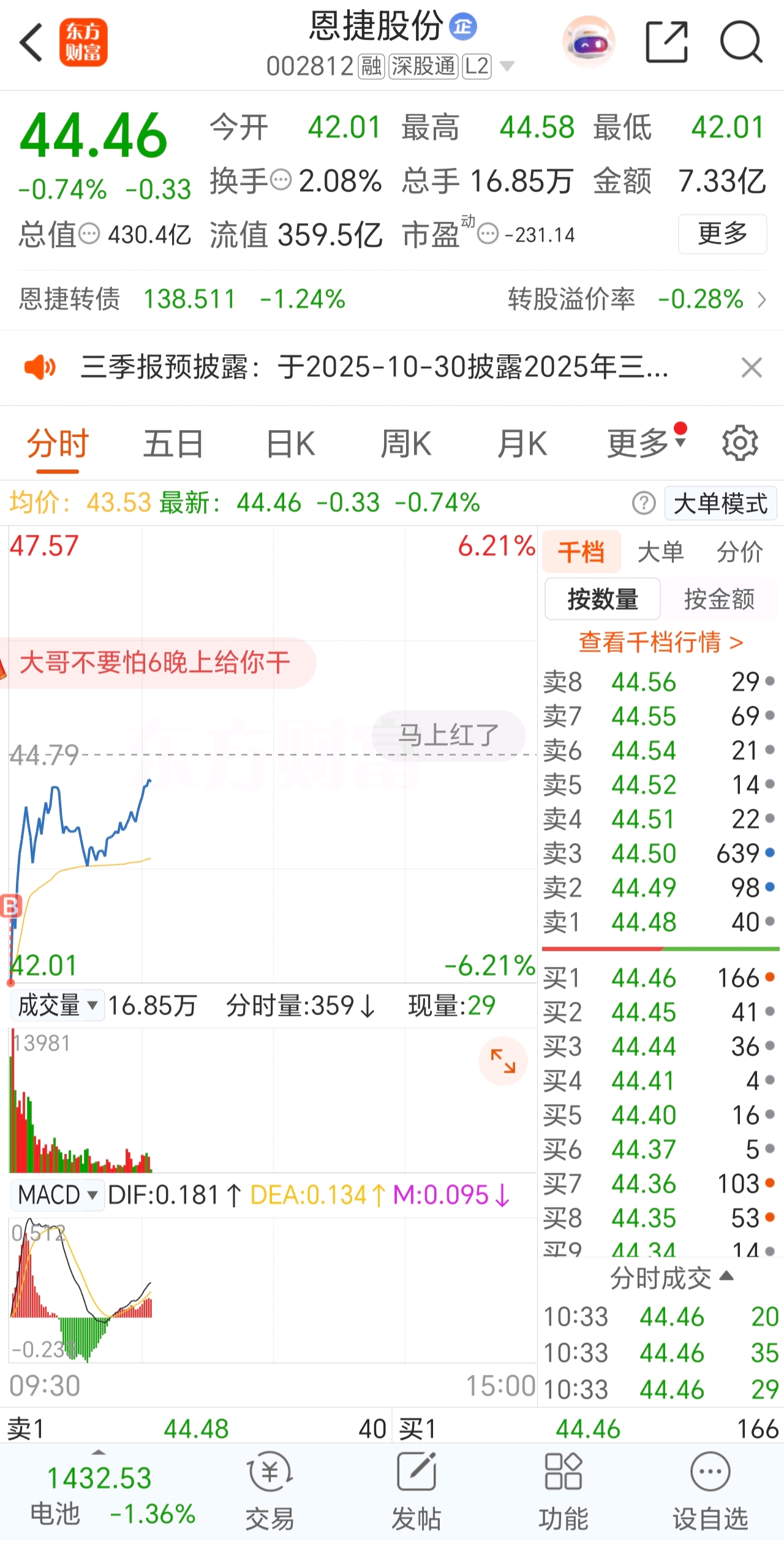 $恩捷股份(SZ002812)$ 恩捷最低点42.01买入,北大荒冲高6个点卖了,账户从负几千到平盘翻红,有惊无险。