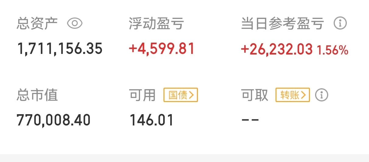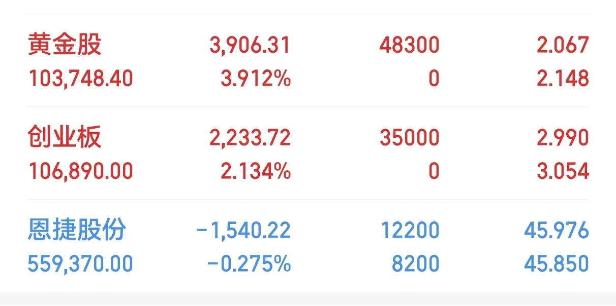 $恩捷股份(SZ002812)$ $黄金股ETF(SH517520)$ $创业板ETF(SZ159915)$ 逢低抄底大A,基本把周五亏的挣回来了,虽然满仓拿着黄金躺平,能挣更多一点,但没必要,目前的仓位比满仓黄金etf健康太多了,至少晚上睡得着,不怕晚上再来个黑天鹅