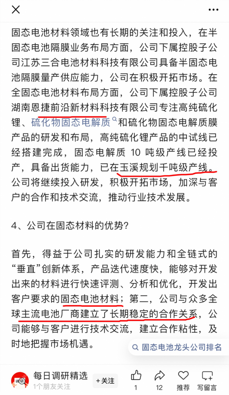 千吨级硫化物固态电池材料,与全球主流各大电池厂稳定合作关系。