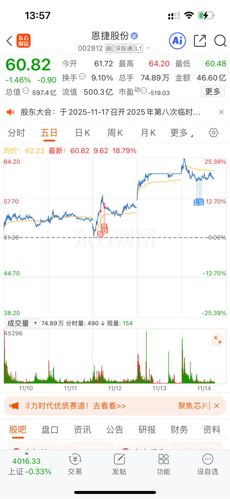 $恩捷股份(SZ002812)$ 先出来了,后悔早上冲高没卖