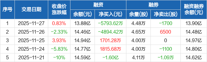 恩捷股份:融资净偿还5793.62万元,融资余额13.88亿元(11-27)
