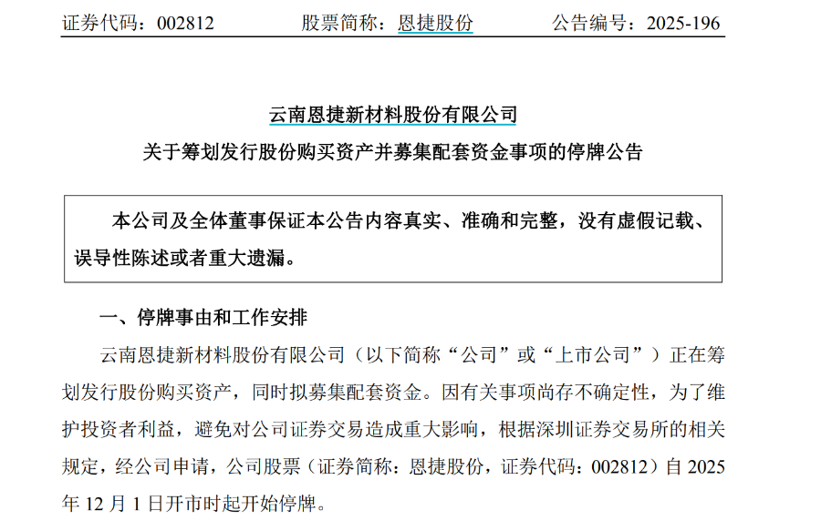 11月30日,恩捷股份公告,计划收购主营锂电池隔膜设备制造的中科华联,交易初步确定拟通过发行股份方式收购中科华联100%股权并募集配套资金。公司股票自12月1日起停牌,预计在10个交易日内(即2025年12月15日前)披露交易方案,若未如期披露,证券最晚于2025年12月15日开市起复牌并终止筹划。