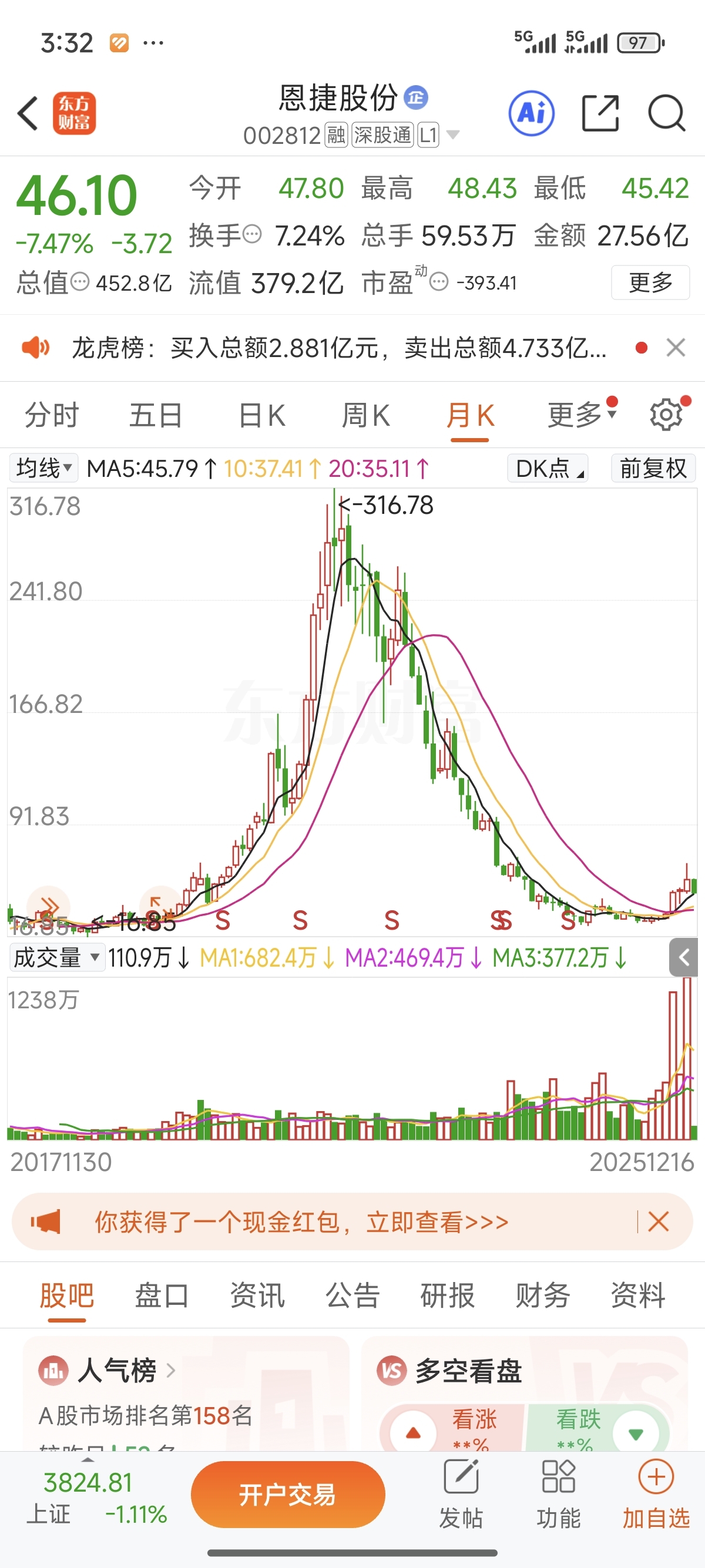 $恩捷股份(SZ002812)$ m低,还能涨会三百块的