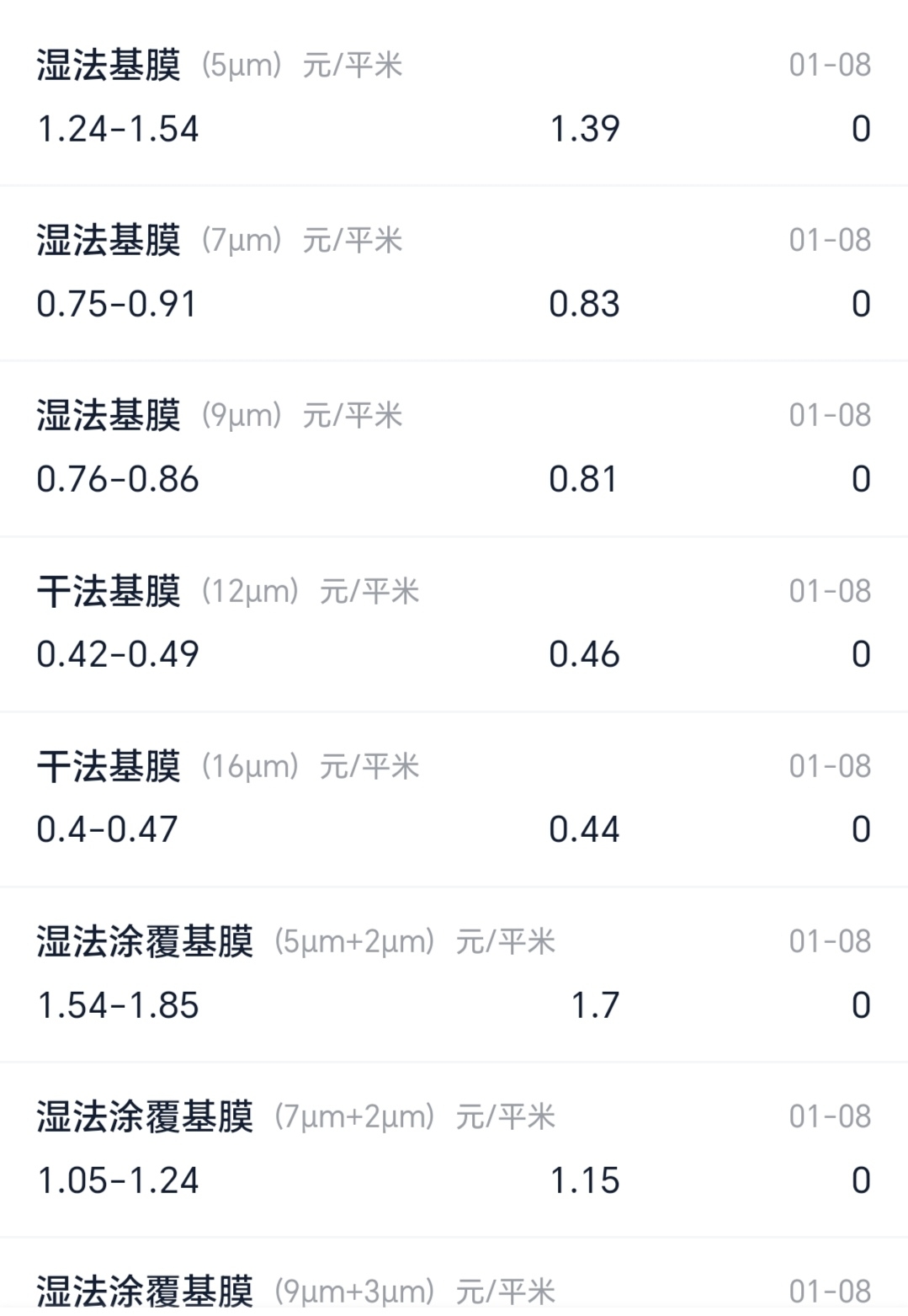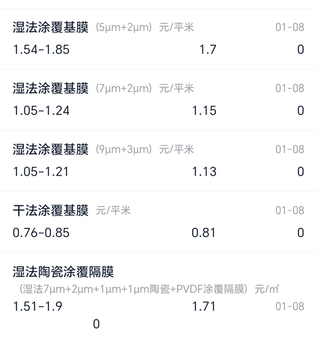 $恩捷股份(SZ002812)$ 恩捷新材料(集团)股份有限公司10吨固态电解质建成投产,千吨级正在规划建设。连续7年成为锂电池湿法隔膜世界级龙头,全球市占率37%国内市占率54%以下是最新湿法隔膜市场报价