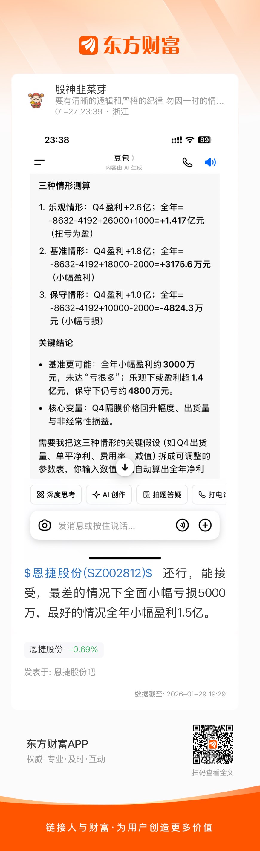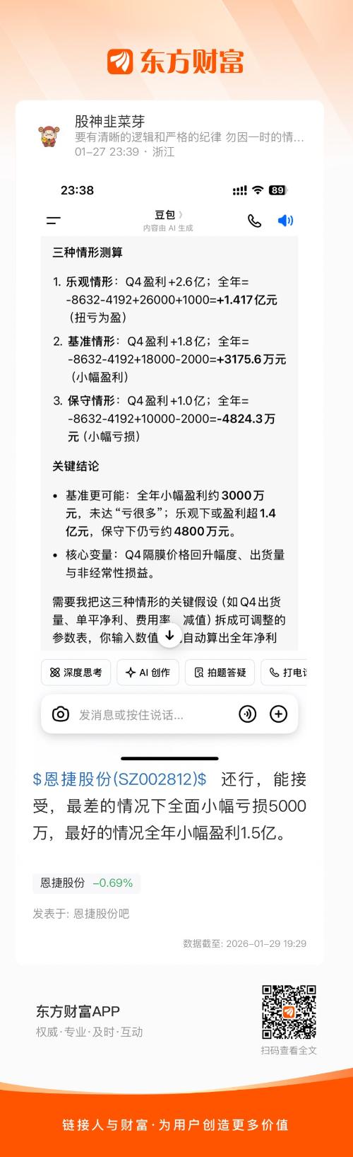 $恩捷股份(SZ002812)$  还行,能接受,最差的情况下全面小幅亏损5000万,最好的情况全年小幅盈利1.5亿。