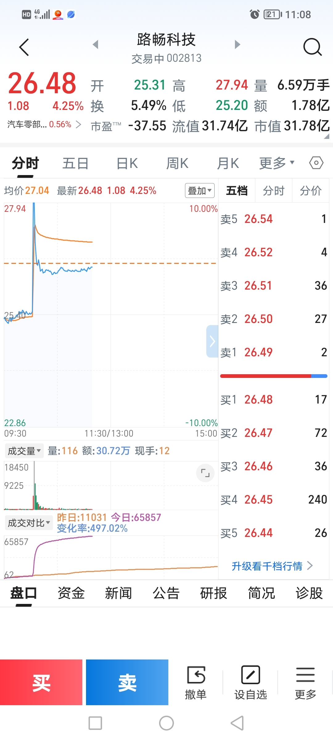 $路畅科技(SZ002813)$ 差点就让我回了本,接了一个电话错过了涨停