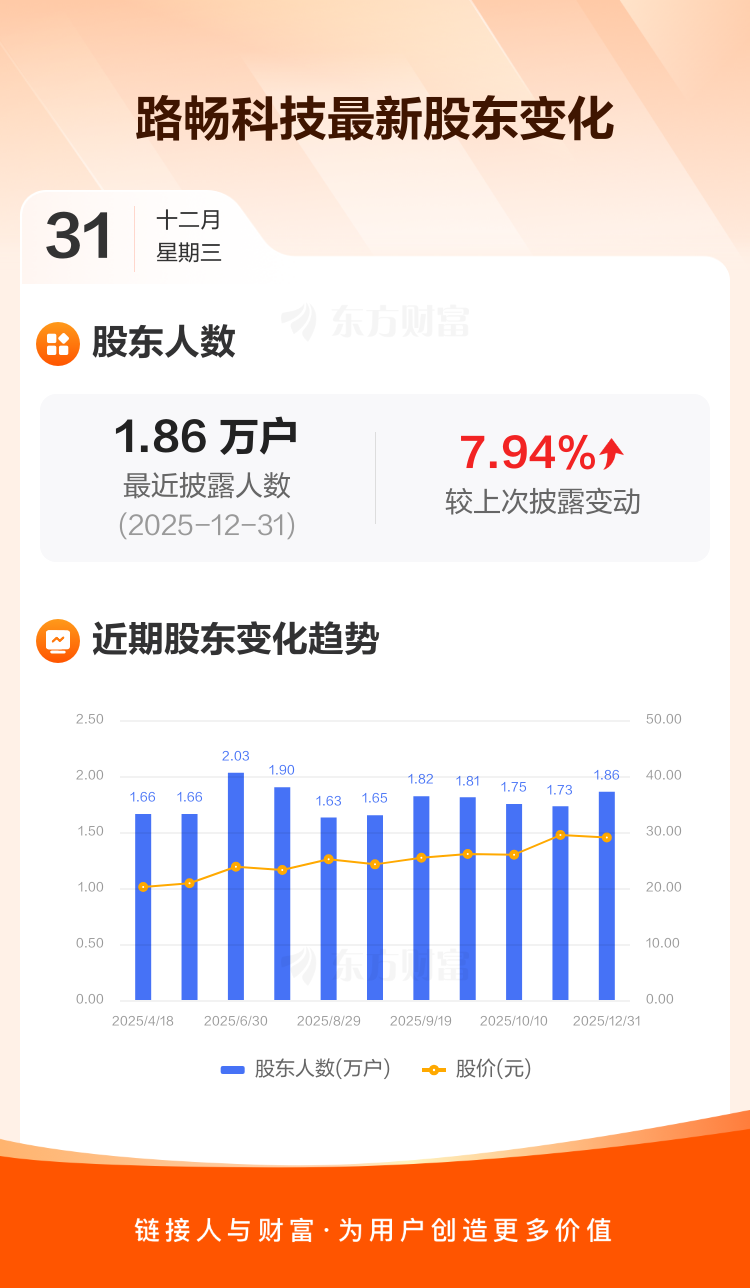 路畅科技最新披露数据显示,截至12月31日公司股东户数为1.86万户,较上期(2025年11月28日)增加1372户,增幅为7.94%。户均持有流通股数量由上期的6940股下降至6429股,户均持股金额由上期的20.44万元减少至18.67万元。