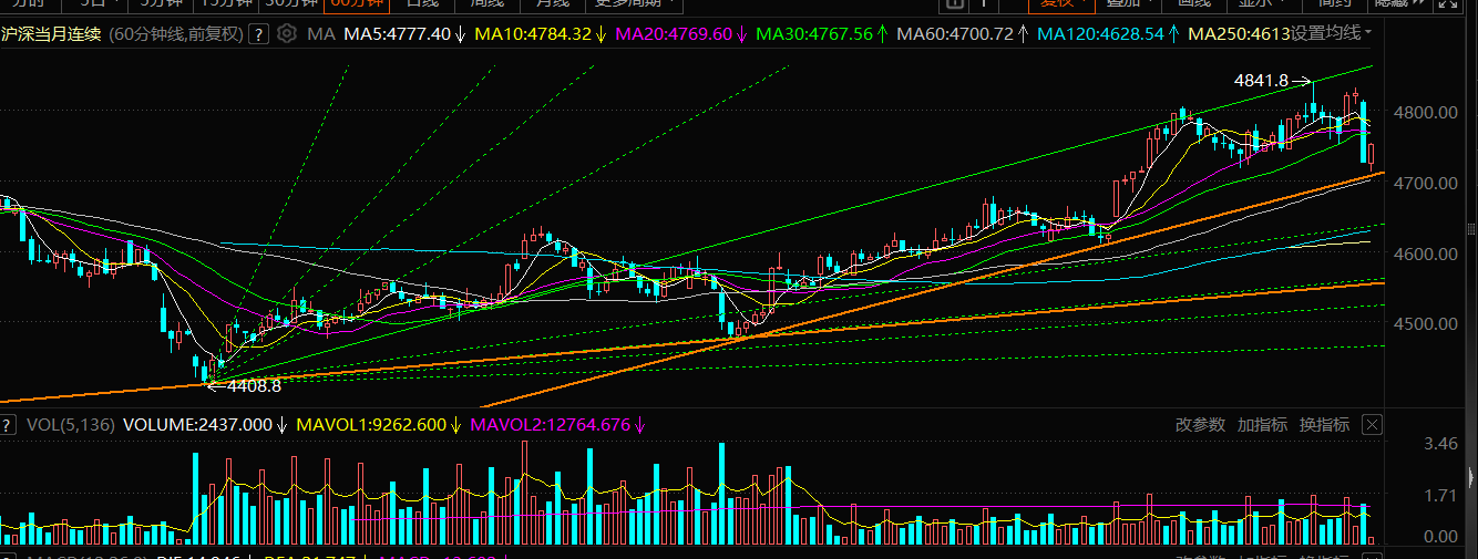 这是指数期货日线形态,阶段趋势线支撑,今天调整结束