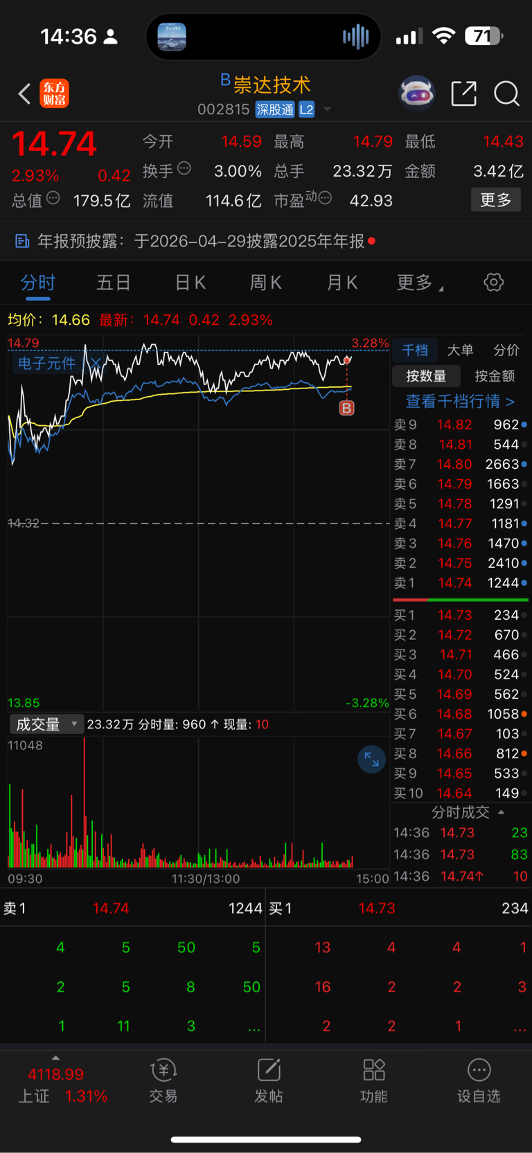 $崇达技术(SZ002815)$ 均价买不到… 跳水14.65埋单没得… 14.69 14.70 都看不到了。 st京机11.96 割地板了… 买进去吃3跌停。 不想卖了,尾盘还被偷袭了。 第二天开板亏1毛钱没接! 真是不信邪不行